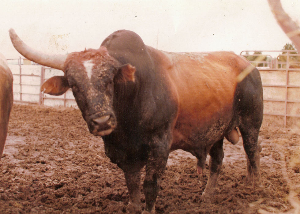 Crooked Nose fought in Cheyenne for 9 years. Born with a disfigured face and having to have a horn removed after his first fight in 1983, he was considered the #1 fighting bull when Wrangler designed the bull fighting program. Crooked Nose learned how to whip his head over with that one horn when the bullfighters would try and work his offside where his horn was gone. He was quick for such a big bull. The bullfighters would say when he was hot on their tail that he sounded like a freight train in their back pocket. The bullfighters gave him his name “Crooked Nose.” Wick Peth, along with many of the top bullfighters thought he was the best fighting bull of their era. Crooked Nose was the first fighting bull ever inducted into the Pro Rodeo Cowboy Hall of Fame in Colorado Springs, Colorado.