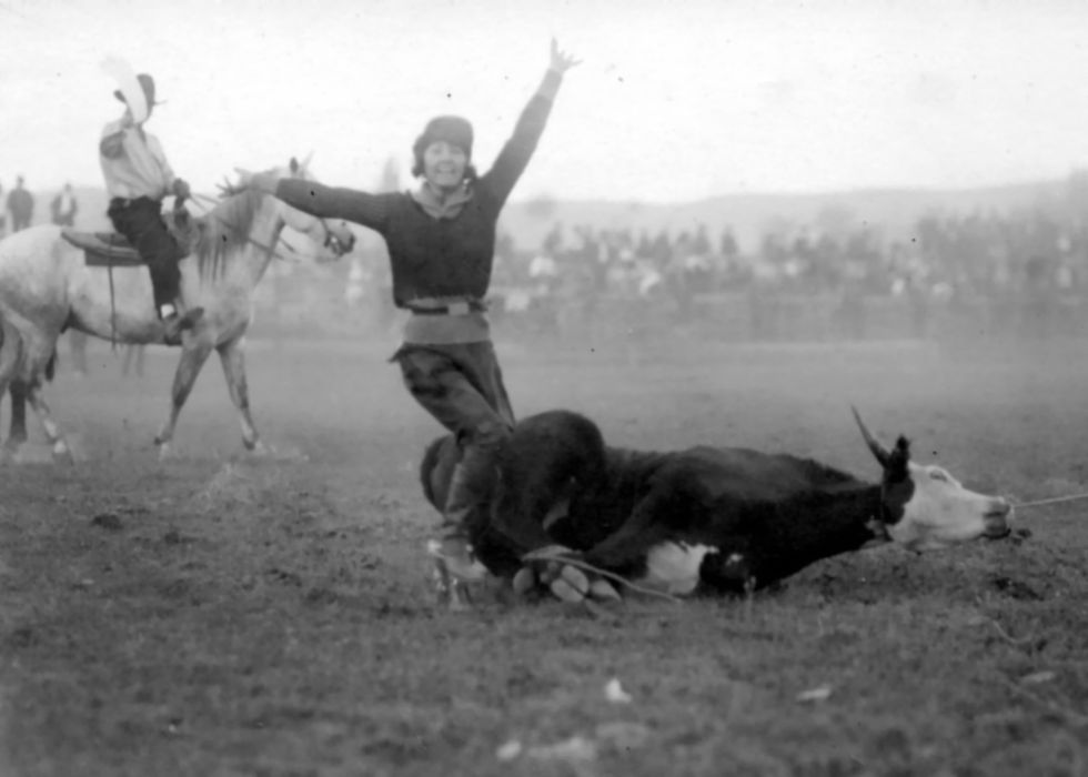 Considered one of the true ladies of rodeo Mabel Strickland had the ability style and showmanship to be able to rope and ride steers bronc ride trick ride and race horses. After her marriage to Hugh Strickland the pair traveled the rodeo circuit together and in 1922 Mabel won the Denver Post Relay Race and the McAlpin Trophy (for All Around Cowgirl) in Cheyenne. In 1923 she repeated her relay race win and added women’s saddle bronc riding champ to her credits. In 1924 and 1925 Mabel Strickland was the only cowgirl ever to be featured on the cover of a Cheyenne Frontier Days™ souvenir program. In 1925 at Cheyenne Frontier Days™ she roped and tied a steer in 24 seconds breaking the world record.
