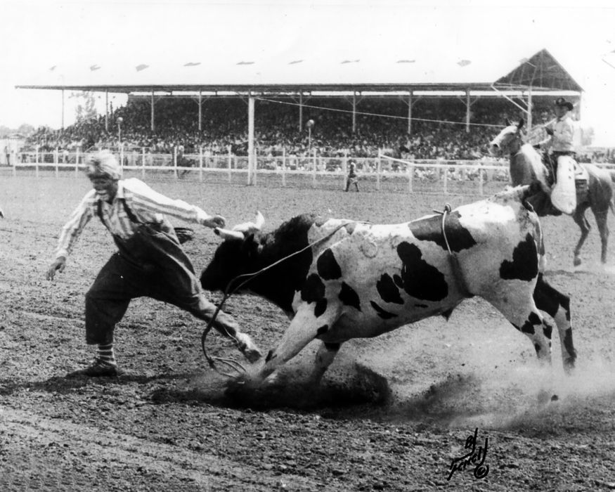 Wilbur Plaugher signed on with Cheyenne Frontier Days™ in 1957. Known as an excellent animal trainer and an outstanding cowboy Plaugher often entered events at Cheyenne in addition to his rodeo clowning and bullfighting duties. In 1958 he turned in a time of 10.5 in bulldogging. In 1962 he entered the steer wrestling competition finishing with a time of 7.9. The last event that he entered at Cheyenne Frontier Days™ was in 1970 getting a good score in the bull riding competition. Wilbur Plaugher brought a clean family entertainment act to the rodeo and continued his style of rodeo clowning until 1983. A deeply religious man he fostered the Cowboy Chapter of the Fellowship of Christian Athletes the first service of which was held in the Cheyenne arena.